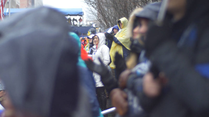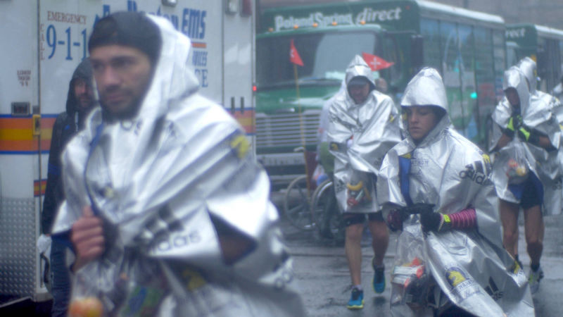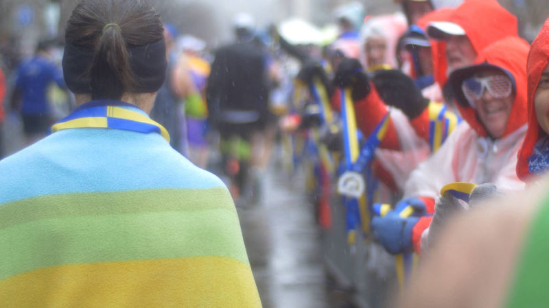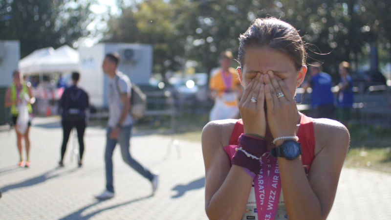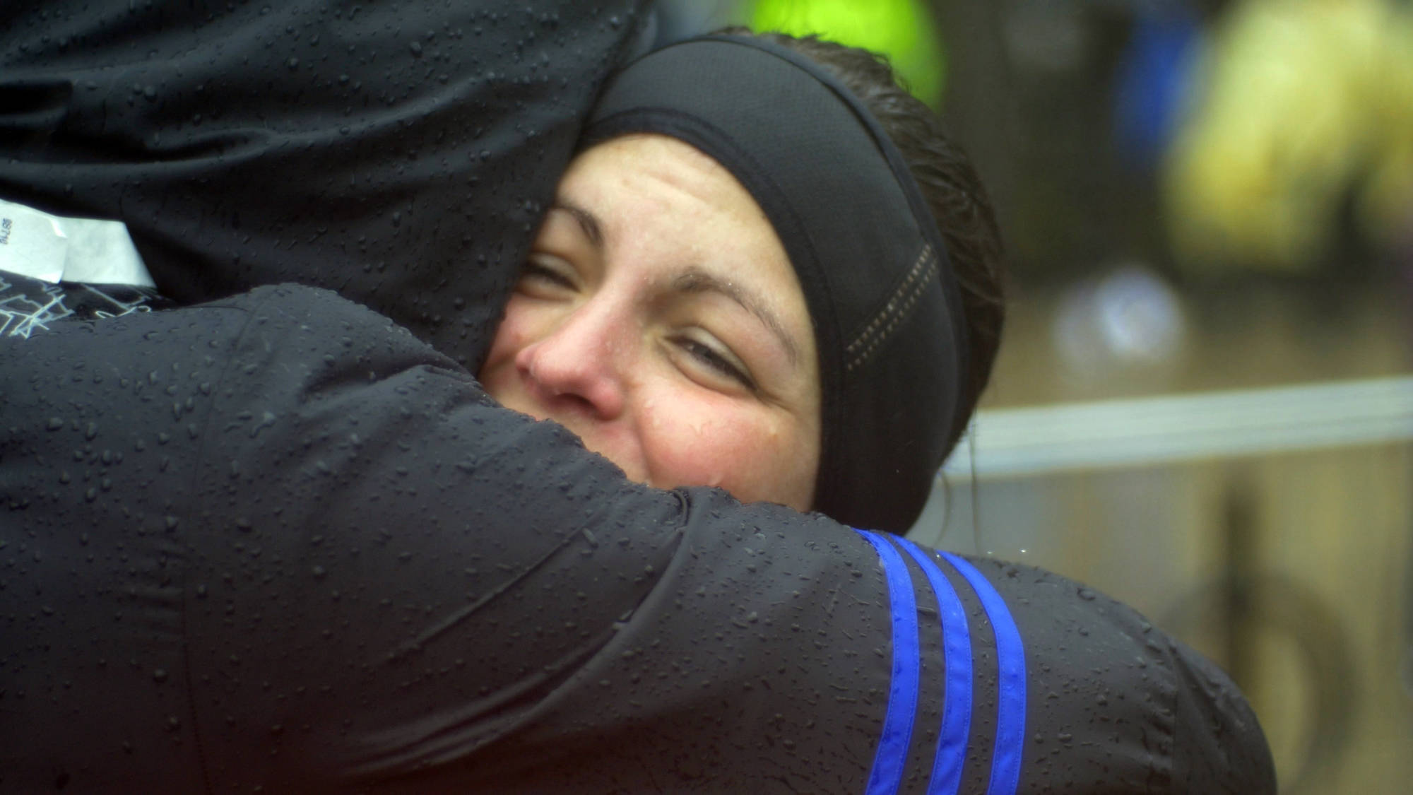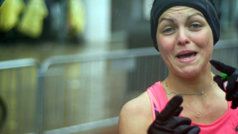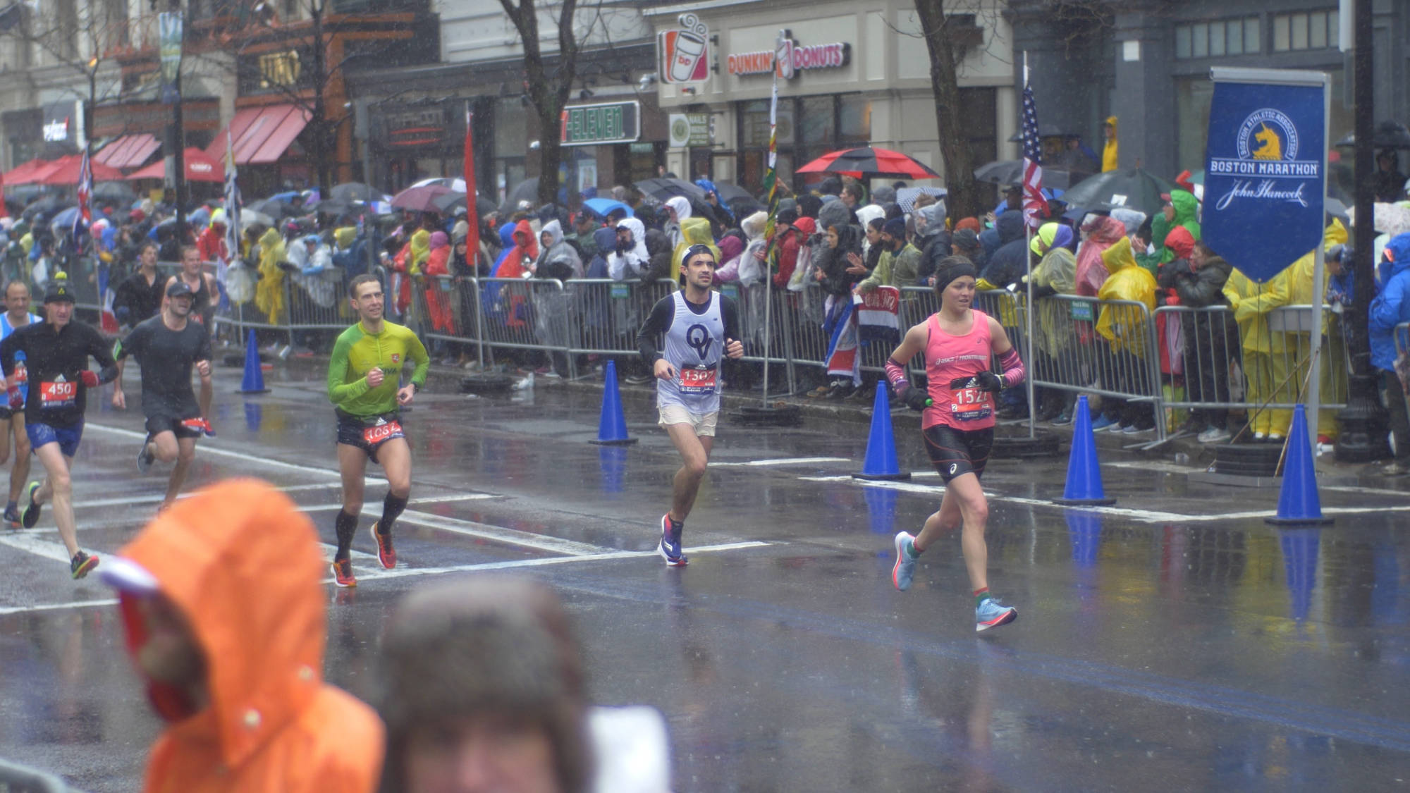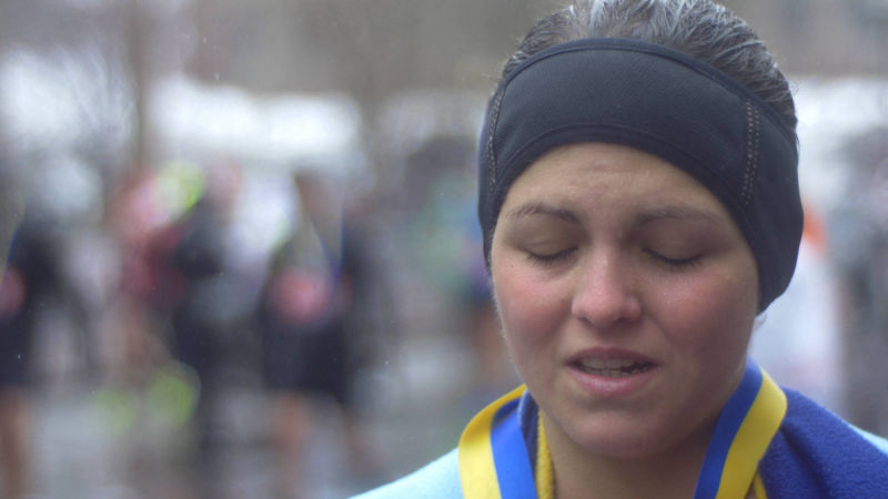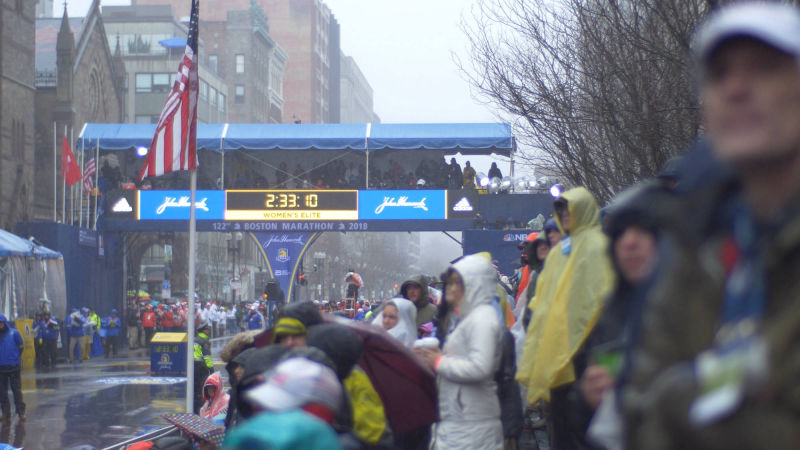Szabó Nóri célba érkezése a kíméletlen időben megtartott Boston Marathonon 2018-ban. A világ legnehezebb maratonján orkán erejű széllel szemben, szakadó havasesőben, +2 fokban. Hihetetlen szép eredménnyel ért célba a körülményekhez képest rekord idő alatt.