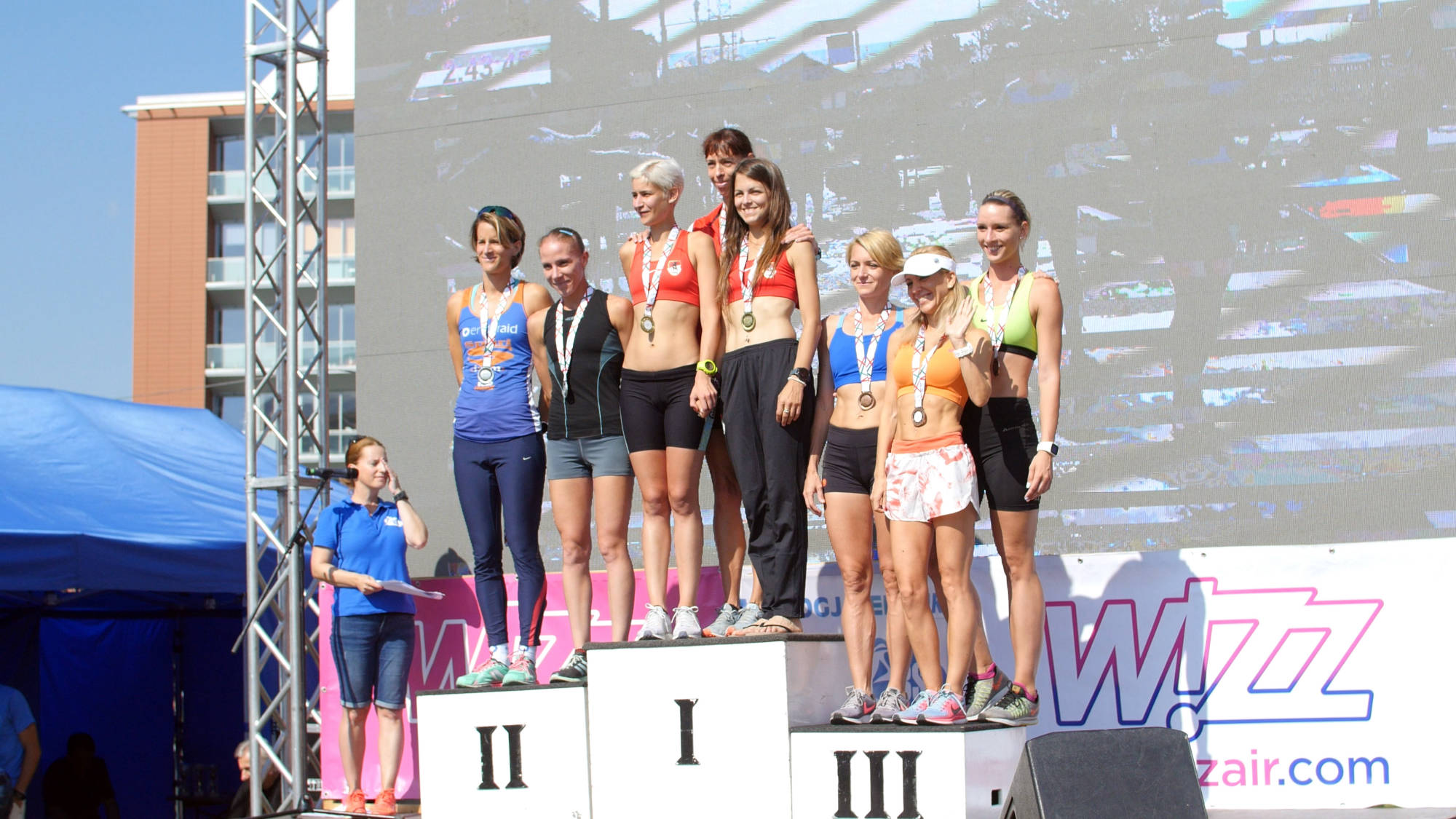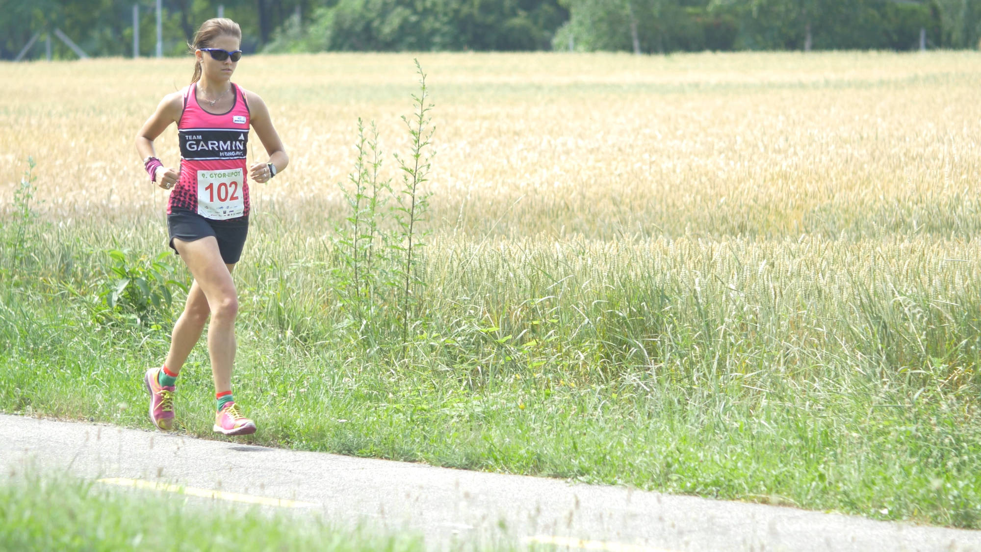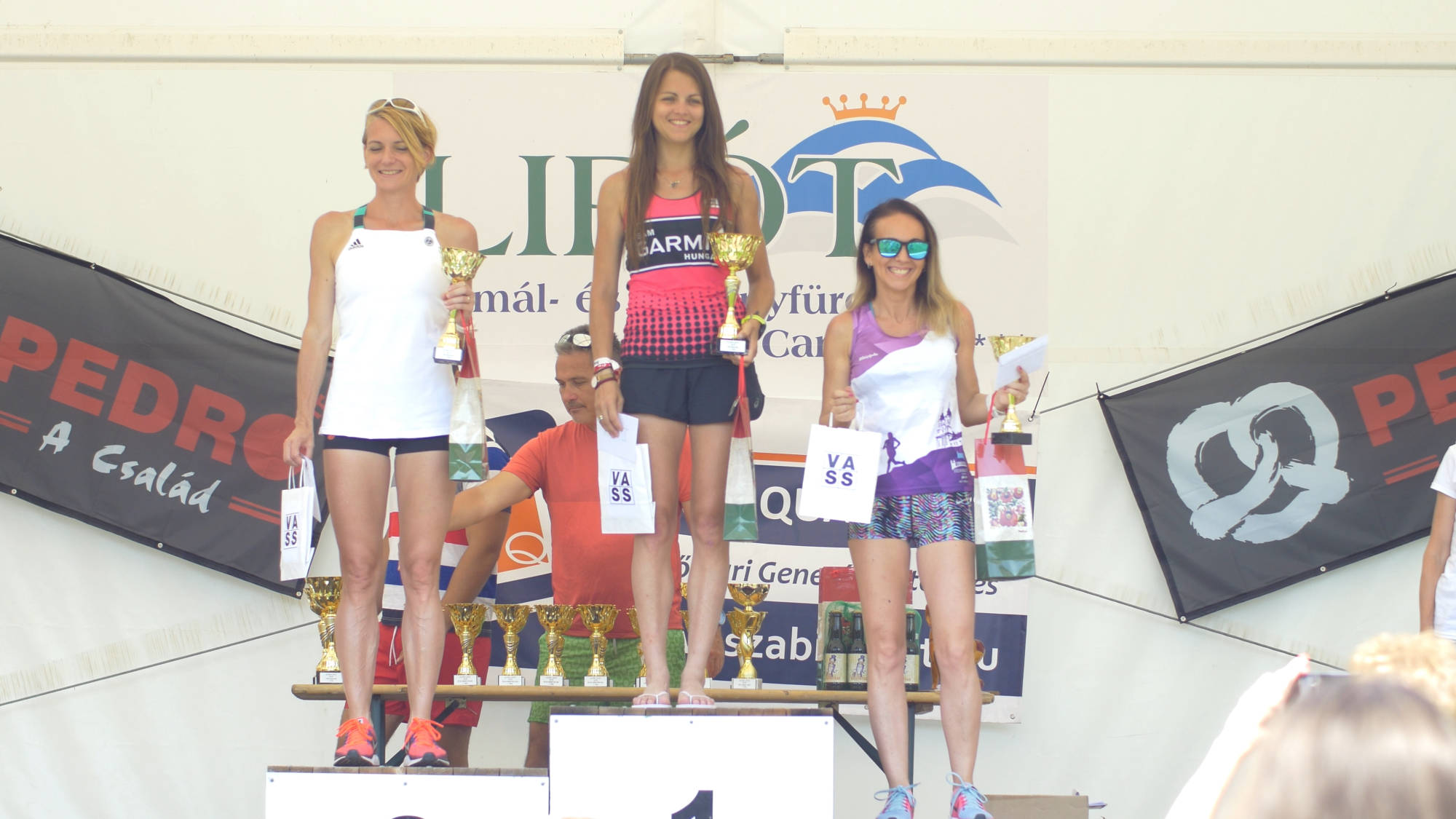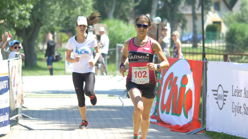 Szabó Nóri célba érkezése a 2018-as Győr-Lipót futóversenyen elsőként a nők között.
