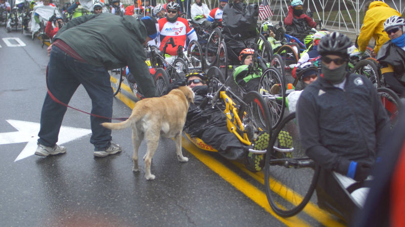 Helyi lakos üdvözli a kerekesszékes "futót".